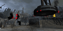 In this map the attacking team must "build" a Hellbender and race it to the exit of the junkyard. There are a few obstacles along the way, with spawnpoints of the defending team nearby. It is their job to delay the attackers as much as they can (by destroying the Hellbender or preventing the other team from clearing the road to the exit). After one of the obstacles has been cleared, a checkpoint becomes available for the attacking team. The team with the fastest time wins.