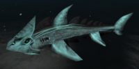 The Allerian Ice Shark has one big dorsal fin, two pectoral fins, two pelvic fins, and a caudal fin. It also has darker, ventral and dorsal finlets. Its head is distinct from its body due to its pointy ridge covering the neck. Underneath the ridge are a number of barbels, and right behind its head are 5 gill openings on either side.