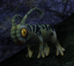 The Seagoat is a small, green, rabbit-like creature that lives in the marshes of Elara V. It has a vertical mouth, two large, yellow eyes, and two curved antennae on top of its head. The Seagoat is docile, but will bite to defend itself when attacked. It is similar to the Nali Rabbit of Unreal by it's use and somewhat by appearance.