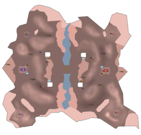 • The map above also indicates the various higher cliffs which are accessible. These cliffs are useful for crossing the map fast. Having a person ready on these cliffs, or on the enemy's sniper post near the river, could significantly shorten the route from one goal to another.