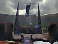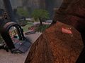 BR-Canyon's lay-out is rather simple. A field, surrounded by high cliffs, is divided into 2 parts by a river. The bomb is located on the bridge crossing the river, in the middle of the map. The terrain is shaped and divided by large rocks, cliffs and hills. The goals are positioned near the back of the fields, and are suspended onto an arch (see picture at the bottom of the page). Luckily, there are 2 jumppads that will kick the player through the goal. A cliff with 2 big Gen Mo'Kai fang-shaped columns (as seen in the 3rd picure below) blocks a direct route from the ball to the goal. It also makes a good sniper post. This cliff can be reached with a jumppad as well. The other cliffs can only be reached with the Translocator. A 2nd sniper post is located on a cliff behind the goals. The rest of the weapons and pickups are spread over the fields, on small platforms on the dirt paths. The spawnpoints near the side/rear of the map, in small pools.