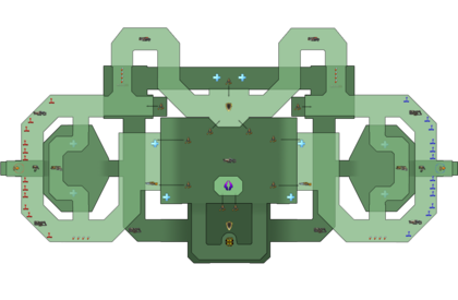 • There are 11 jumppads that connect the ground- and top-floor in total, 9 of which are in the Main Hall. Because of this, there are many routes one can take to the other team's goals. View the map above for the different routes and possibilities.