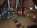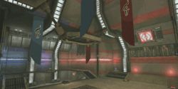 As described in the map's own description, this indoor level mostly consists of corridors which link the level's Goal Rooms with the Main Hall, where the bomb spawns. There are 2 "floors" in this arena. The top floor is where the teams spawn and where most of the weapons are. There is also a teleporter near the team's spawnpoints, which leads to the Minigun Room, north of the Goal Rooms/Main Hall. The ground-level provides the quickest route to the Goal Rooms, as well as the Goals themselves. The distance between the Bomb and the Goal is quite short, when taking the shortest route. However, because the corridors are relatively narrow, it's still no easy task to reach the Goal. As with most Bombing Run maps, jumping through the Goal will award the team with 7 points, but it will also mean the death of the carrier. In this case, the carrier will have to jump into a horizontal ventilation tunnel, filled with obstacles to show off the engine's new ragdoll physics.