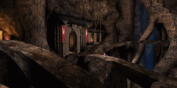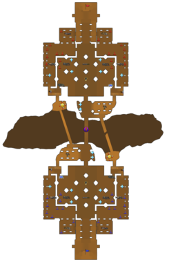 Bridge of Fate is a large Capture the Flag map set in a moody cavern. The 2 bases are divided by a large canyon that runs through the middle of the map. There are 3 bridges that cross this canyon, one of which is broken, but the gap can be jumped over. The bases feature an enormous hall with sky-high pillars and a few other, smaller rooms. There is virtually no z-axis gameplay here, apart from the Flag room and the area in/around the canyon.