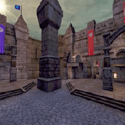 About the bases themselves, they're big rooms holding a Redeemer in the middle of them. The lower level has a series of pillars serving as cover as well as a stair on the middle north (red) or middle south (blue) leading to a C-shaped hall surrounding the base and connecting the lower level with the upper level, or the C-shaped irregular ledge overlooking the Redeemer. Aside of the upper entrance, there's an opposite translocator-only entrance by way of a sniper balcony overlooking the midfield, and, of course, the three cathedral-esque closer entrances between them in the lower level. At the east (blue) or west (red) side of the main room, there's a stair leading to the flag base, which is overlooked by two balconies accessible with this C-shaped surrounding passage... which can also be accessed by a passage in the north (red) or south (blue) extreme of the flag base.