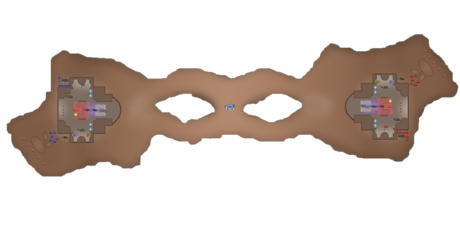The lay-out is very simple: 2 tall towers are placed on the opposite ends of a meteor. These towers are connected with 2 rocky paths that join briefly in the middle (resulting in an X shape, viewed from above). Sniping plays an important part in this map, as both towers have multiple sniper posts at various heights. Players spawn next to/behind the towers, and are thus vulnerable to the enemy's snipers until they are inside.