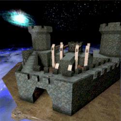 An almost symmetrical, big floating asteroid holding a castle in it. The castle itself is embedded into the asteroid and holds several areas of interest.