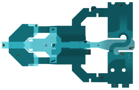 Cybrosis consists of 2 floors, with large rooms on the bottom floor and mostly corridors and small rooms on the 1st floor. Several electrical beams can be found across the map (7 in total). When a player or bot touches these beams, he/she dies instantly. Most of these beams are near valuable pickups and weapons.