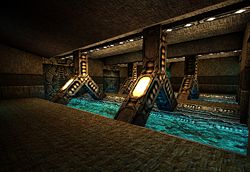 One of the most important features of the map are the deadly electrical beams. Just like most other death traps, this can be used to get a few easy frags. Proper aiming and choosing the right projectile is all-important to success. The Flak Cannon (which is widely available in this map) alt-fire does a good job of knocking the opponent back (or up, when aimed properly). If it doesn't push the opponent up into the beam, it will still likely frag it on impact. The Flak's alt-fire is particularly effective in the dead ends this map has. The small rooms housing the GES Biorifle and Minigun don't give bots the room to dodge big projectile like the Flak's alt-fire or rockets, making it an easy frag. Also be sure to nose around for pickups. The Superhealth, Kevlar Suit and Rifle are among the pickups that bots will not touch (and will therefore be available for the player).