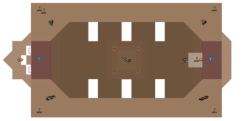 DM-Letting's lay-out is similar to that of maps like DmMorbias and DM-Fractal. It's a single room with 2 floors and a series of large columns. The ground floor has a rectangular floorplan, while the 1st floor (which is a lot higher than in Morbias or Fractal) is a walkway on the outside of the map. Lifts from the ground floor to the 1st floor are placed on opposite ends of the room. Above these 2 floor is a cage, suspended to the ceiling. There are 2 ways of getting to this cage: Be lucky enough to spawn there or use the warpzone in the west of the map (as indicated on the map) to get inside. Pushing a button at the back of the cage will open it, giving access to the Shield Belt outside. Be careful though, as there's a button in the middle of the map underneath the Eightball Gun which triggers a crushing mechanism in the cage, killing everyone inside.