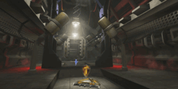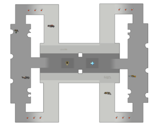 The lay-out of this small Deathmatch map is rather simple. The ground floor consists of 3 corridors which form a an "I" shape. There's a slope at each of the 4 ends of this "I" which lead to either of the 2 ledges in the main hall (the middle part of the "I"). Most weapon pickups can be found on the ground floor, as well as the only 2 health/armor pickups. The more powerful weapons, however, are on the top floor.