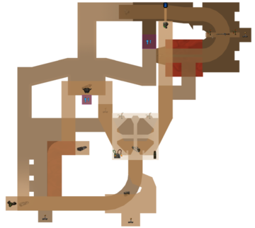 Loxi is a small DM map with a medieval theme. There are 3 floors: The ground floor is only 1 room large, but has some valuable pickups like the Shield Belt and the Jump Boots. The 1st floor is the largest, spanning several rooms and featuring half of the weapons. These 2 floors are connected by a single lift. The 1st and 2nd floor are connected via a lift and a slope. The 2nd floor has the other valuable pickups such as the Eightball and Superhealth. There's also an outside part atop the main hall with the Eightball pickup. The rooftop can only be reached with the help of the Jump Boots from the ground floor.