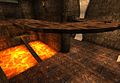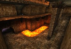 Another tactic is to try and push the opponent into the lava. This is the easiest on the ground floor, as bots will walk over a thin beam to get to the Shieldbelt. However, it isn't visited often by bots. The other lava bath will see more bots walking by, but it's slightly harder to push the bots into the lava due to the pillars standing in the way (as well as the difference in height).