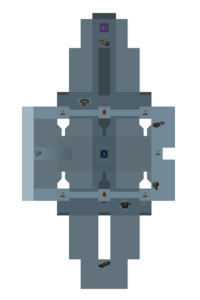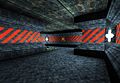 FITH is a medium-sized DM map in a technical facility of sorts. The name FITH (short for "Fire In The Hole") comes from this map's unique feature. In one of the walls in the main hall (the back wall in the screenshot above) there's a small opened hatch, exposing a core. When shot, the hatch temporarily closes while the ground starts to shake heavily (making aiming impossible for a few seconds) and a message appears saying "Only four more to go..." After a while, the hatch will open again so the core is exposed. Shoot it 4 more times to destabilize the core. What this will do is open a hatch in the floor in the middle of the main hall, leading to the facility's sewers with powerful pickups. A few seconds after this hatch opens the core will blow up, causing everyone in the upper part of the facility (ie: not in the sewers) to die.