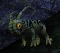 The Seagoat is a small, green, rabbit-like creature that lives in the marshes. It has a vertical mouth, two large, yellow eyes, and two curved antennae on top of its head. The Seagoat is docile, but will bite to defend itself when attacked.