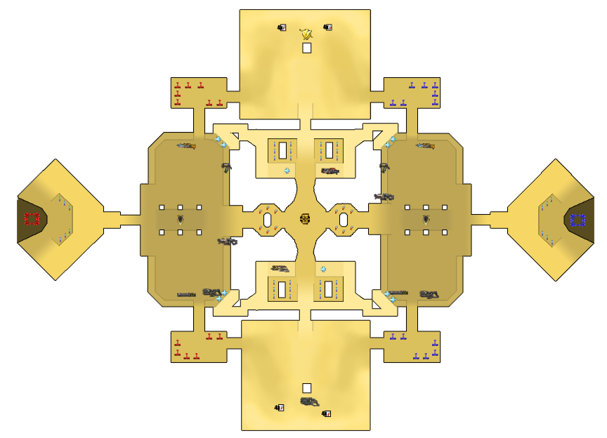 | current | 10:42, 2 July 2008 | 864×624 (135 KB) | Kaithofis (Talk | contribs) | (Weapons and pickup locations in BR-Anubis The different shades indicate the height of the terrain, where lighter = higher, and darker = lower ground. The areas beneath the goals are deep pits which will instantly kill anyone who falls in. ==Legend== Ima) | |