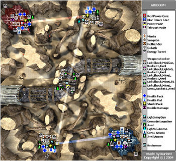 The node layout is rather simple, with only 3 nodes in a single line between the 2 powercores. Furthermore, Aridoom has only a few valuable pickups and no flying vehicles (even though the map does have flyingpathnodes: Actors used to make bots fly vehicles along certain paths).