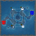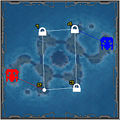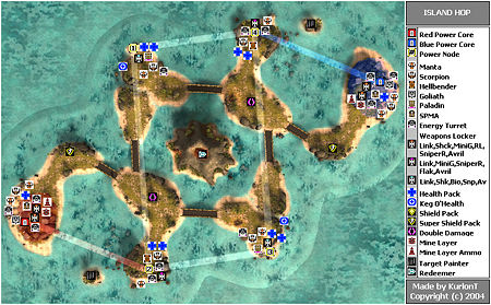 Island Hop is an Onslaught map consisting of six large islands in a diamond shape, connected via bridges. In the center is a volcanic island, the middle of which houses a Redeemer (see map). On the outskirts of the map are small, secluded islands housing target painters. On each of the diamond islands except the center, there is one powernode for each island, and on the farthest corners on the east and west sides lie the powercores.