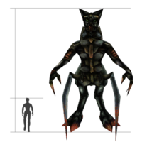 The Skaarj Queen is the final boss in Unreal, and is the most important of all the Skaarj. She is over 20 feet tall, and has 2 fully-developed arms and legs, much like other Skaarj classes. Her legs are quite different and appear to be avian in structure and allow her to move faster than the player. The Queen also has 2 less developed secondary legs, which she uses to keep her balance and to stab her prey (explaining the blood stains). When walking, these limbs seem to examine the surface in front of her feet, similar to how insects use their antennas to get a sense of their surroundings. The Queen probably uses these limbs as an extension to her eyes, as her eye height of roughly 19 feet limits her view on the surface underneath/near her feet.