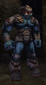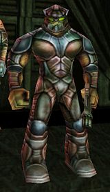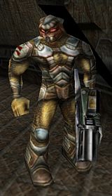 The second weakest of the caste, this class also shares its name. Troopers are roughly on par size-wise with a Scout (7.5-8 feet) but are yellow in color, and wear light gray/white armor, consisting of shoulder pads, knee-height boots with knee-pads, a pointed helmet, bracers, a light chest-plate and a belt with crotch plate. Although they start out with a Dispersion Pistol and the armor pictured on the right, they may ultimately be found wielding any of the game's weapons, and wear any of the Trooper's armor sets. It is possible for a Trooper to wear an Officer's armor, and the only difference between the 2 classes is their size. As stated above, most Skaarj Troopers will be equipped with a Dispersion Pistol, with which they pose little threat. Others, however, carry Automags or the Marine weapons found in RtNP.