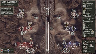 Sandstorm is an axially symmetrical U-shaped map with a large wall structure that seams to be a part of the ruin of an aqueduct that separates the two main areas. There are two ways through it, of which only the northern passage is accessible by any vehicles and on foot. But you can also climb on top of the structure using the elevators on the north site or the large stair case in the middle, that can be used by a Scavenger or a player using Jump Boots.