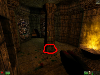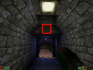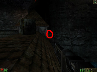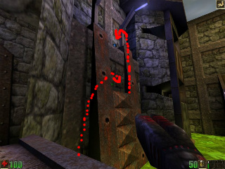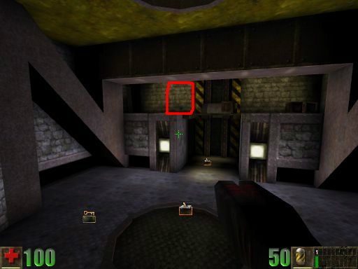 Go to the room right after you cross the bridge and turn around. Fire at the button in the red box that I've drawn then look to your right as a part of the wall opens. Run in, grab the jumpboots and proceed to the picture below.