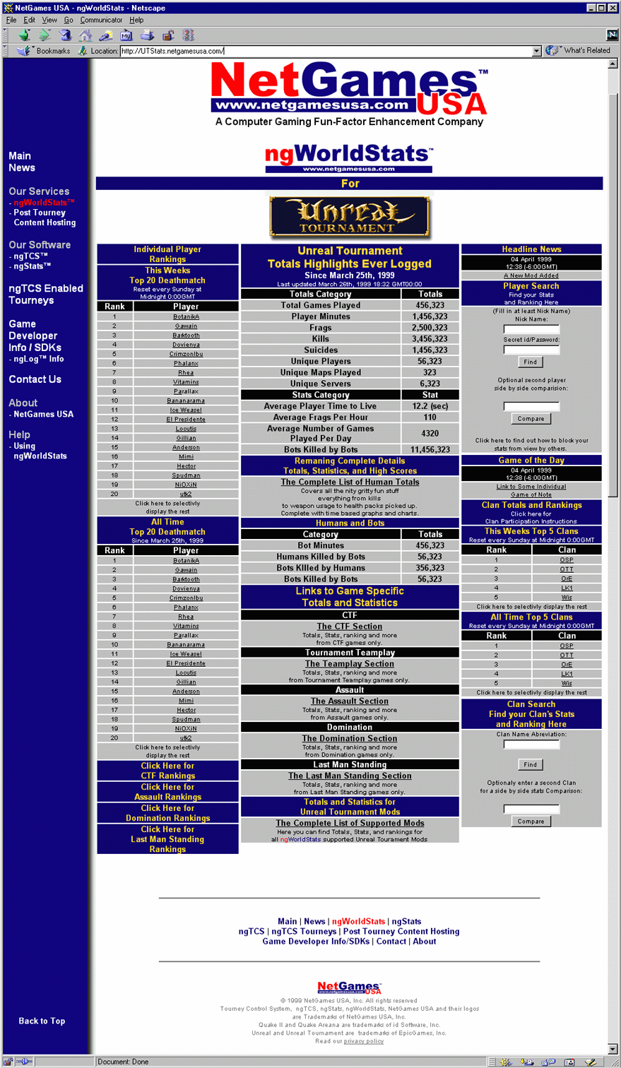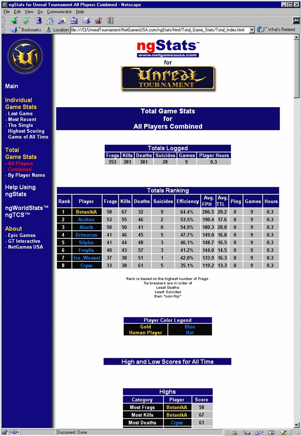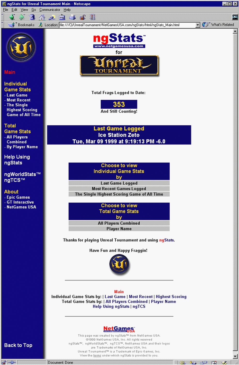 Unreal Tournament will ship with out of the box support for statistics logging and ranking using Net Games USA's ngWorldStats software. The software allows players to track their performance online at ut.ngWorldStats.com. You can track tons of different types of stats: your kills, your best game, your total score overall, and so forth.