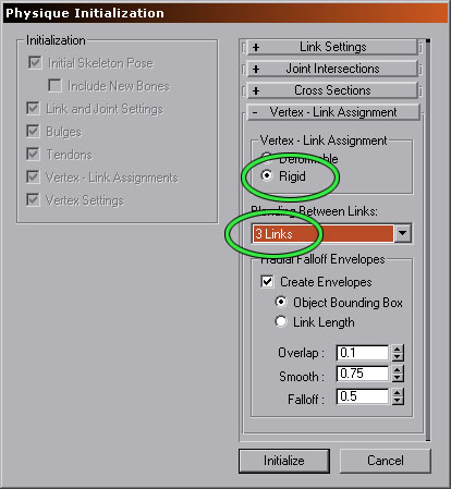 When linking a mesh to a biped (or any hierarchy for that matter) you must initialize with Rigid Vertex Link Assignments. If you do not, what you see in Max will be different from what you see in the engine. This is because Max's Deformable mode computes vertex deformation in a special way which is not duplicated in the engine. The image to the right shows the correct initialization settings, along with the recommended 3 link maximum. All of the other settings can be left as their default, or set to whatever you normally would use. Editing vertex weights may be done by adjusting envelopes or by assigning vertices manually (or even typing in values). When exported, all weights are normalized so they add up to 100% influence automatically. |
