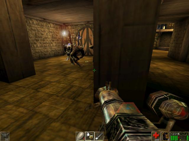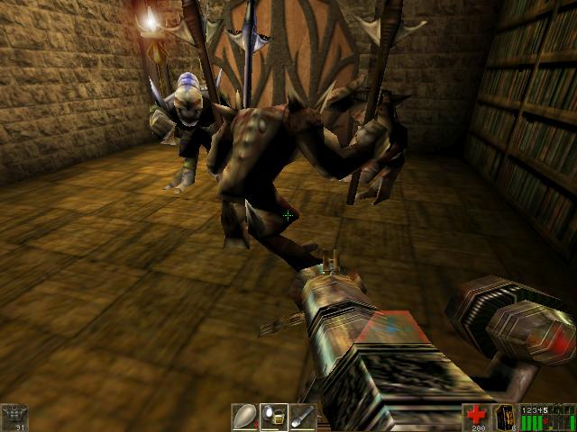 Just as you enter, a bookshelf falls and A Skaarj behind it attacks you.